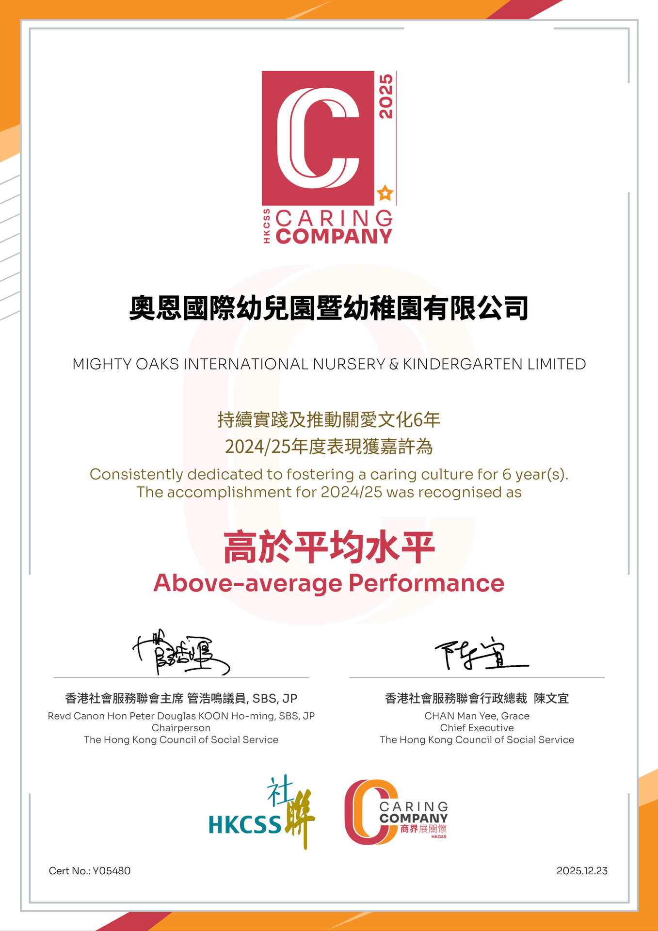 At Mighty Oaks International Nursery and Kindergarten, our mission has always extended beyond the classroom walls. We believe that to raise compassionate, character-driven children, we must lead by example. It is with great pride that we announce that Mighty Oaks has been awarded the Caring Company (商界展關懷) Logo for the sixth consecutive year.